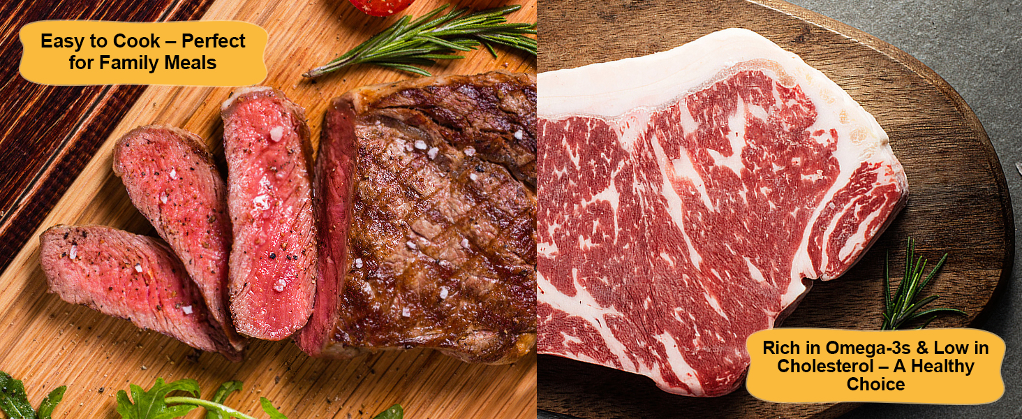 Whether pan-seared, grilled, or slow-cooked, the steak keeps its natural tenderness and aroma, filling your kitchen with mouthwatering fragrance. From pasture to plate, every step — from careful butchering to cooking — is crafted to deliver a restaurant-quality experience at home . Every slice, every bite, is a celebration of premium beef, texture, and taste.